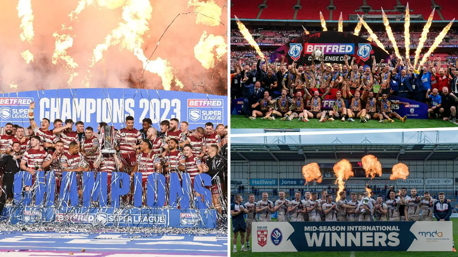 Wigan Warriors (left, Super League Grand Final), Leigh Leopards (top right, Challenge Cup) & England (Mid-season international) celebrate silverware in 2023 - Alamy