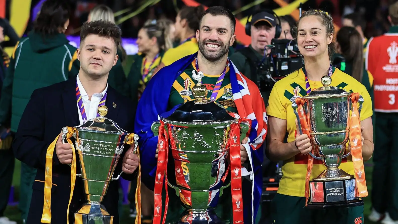 Tom Halliwell OBE (left - England Wheelchair), James Tedesco (centre - Australia men) and Kezie Apps (right - Australia women) with their respective World Cup trophies - Alamy