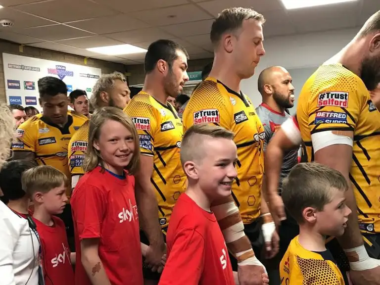 With Salford wearing their one-off charity shirt to support the victims of last year’s Manchester bombing, the Bears emerged with them from the tunnel before lining up in front of the Milburn stand in full view of the Sky Sports cameras.