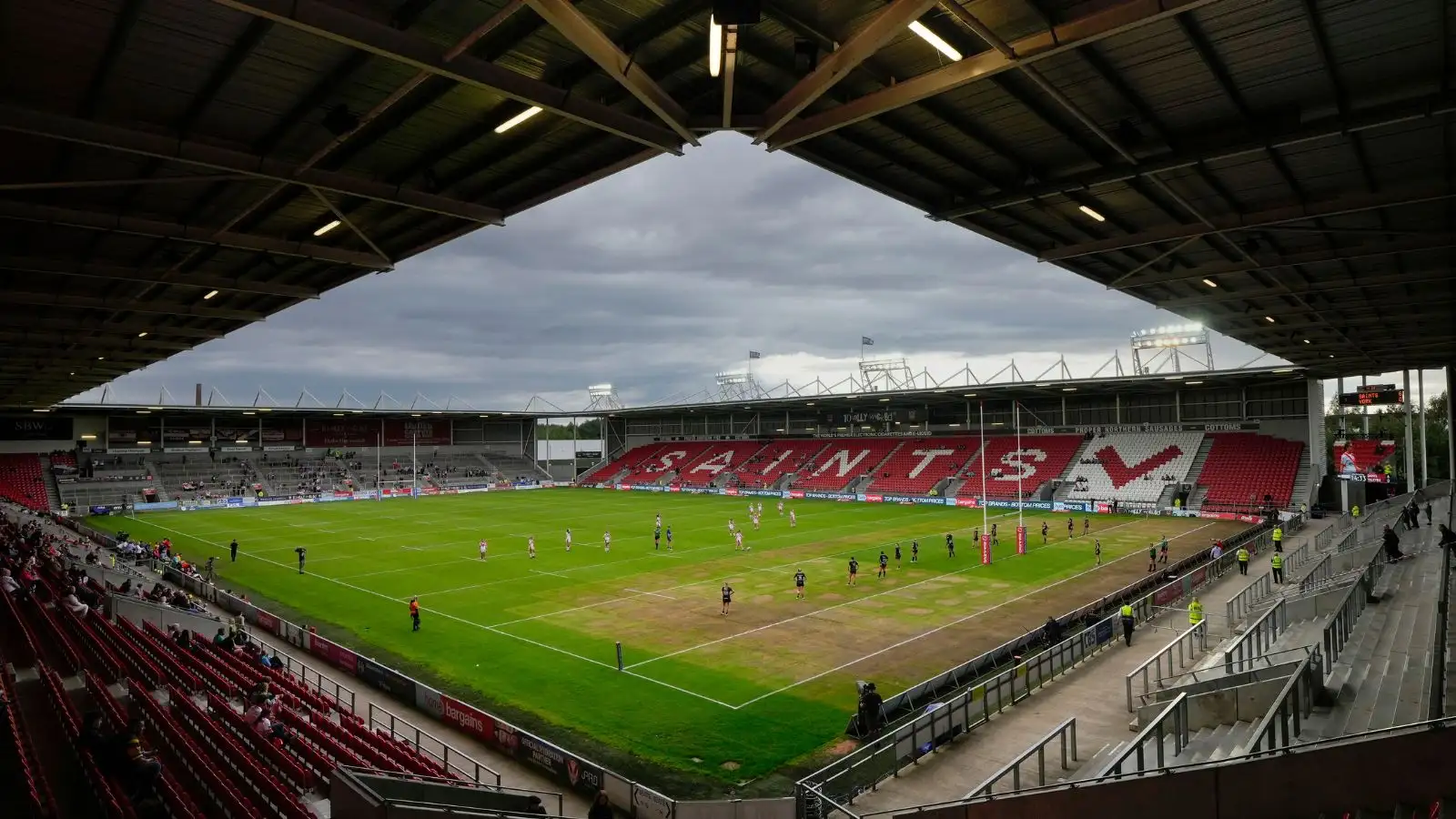 In the Men’s Super League, the four-peat reigning champions take on Leeds Rhinos, with the pitch visibly rough in certain patches, particularly in front of the away stand.