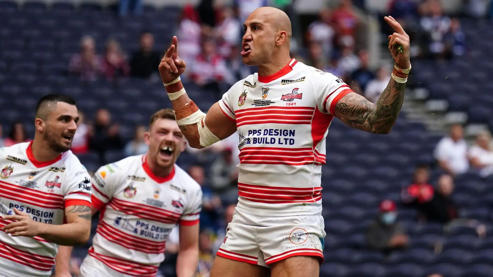 Blake Ferguson celebrates a try for Leigh during their 1895 Cup final triumph over Featherstone Rovers in 2022