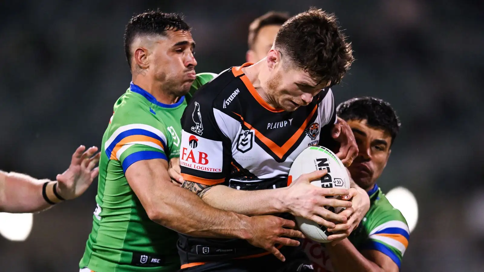 John Bateman of the Wests Tigers is tackled by Canberra Raiders half-back Jamal Fogarty during the NRL Round 23 match. Photo by AAP Image/Lukas Coch.