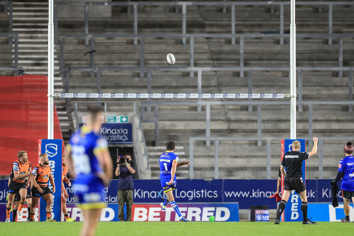 Stefan Ratchford (1) of Warrington Wolves converts for a goal to put Warrington in the lead to wing the game 10-12
