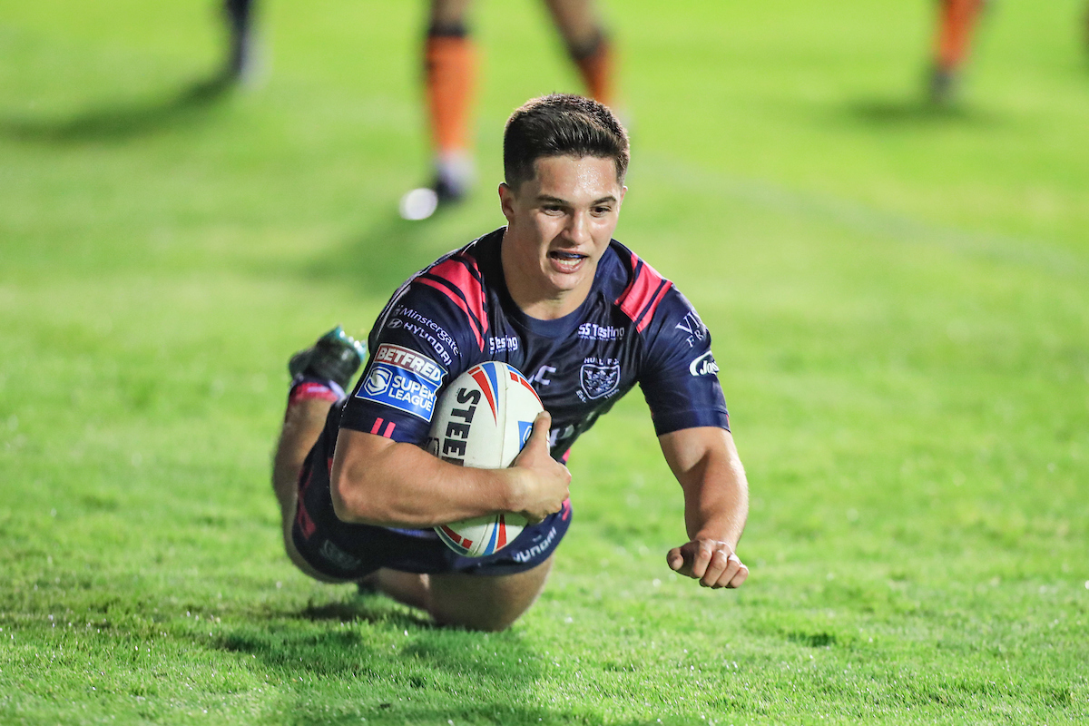 Ben McNamara (35) of Hull FC goes over for a try