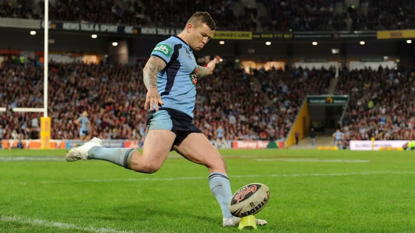 Todd Carney kicks a conversion for New South Wales during a State of Origin clash in 2012