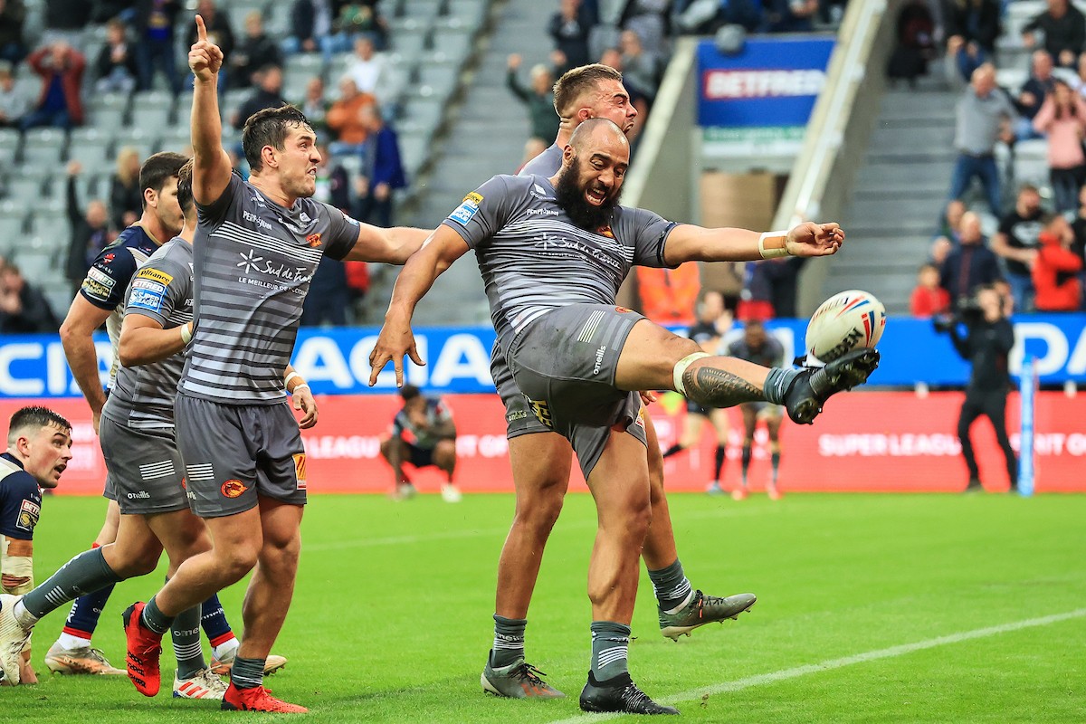 Sam Kasiano of Catalans Dragons celebrates his try