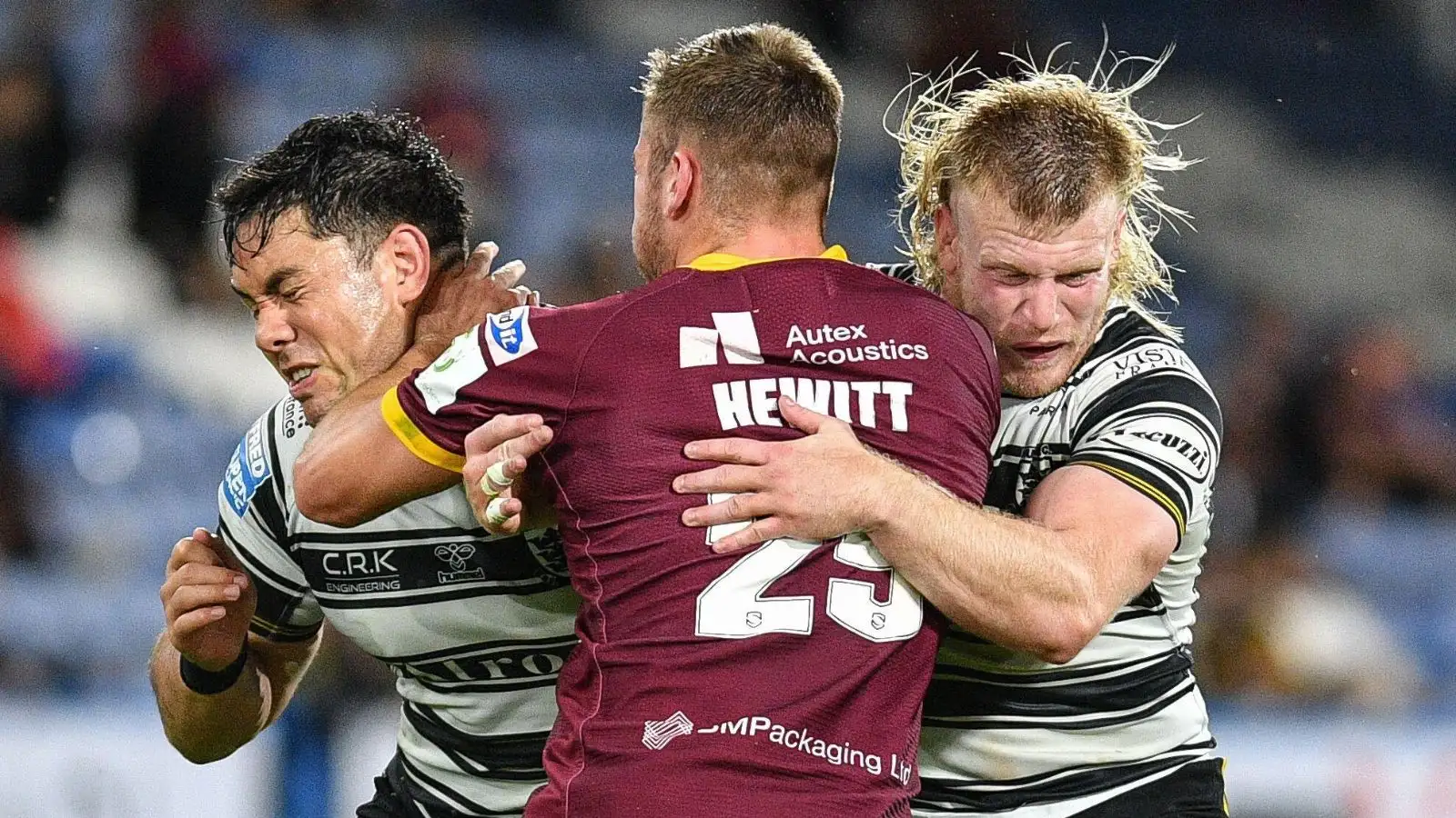 Andre Savelio and Hull FC team-mate Brad Fash tackle Huddersfield's Sam Hewitt. Picture by Dean Williams / Alamy Stock Photo.
