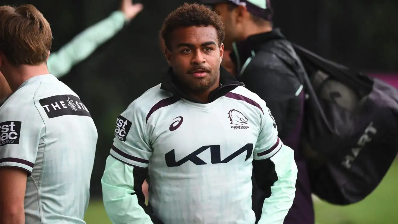 Ezra Mam looks on during a Brisbane Broncos training session in 2025