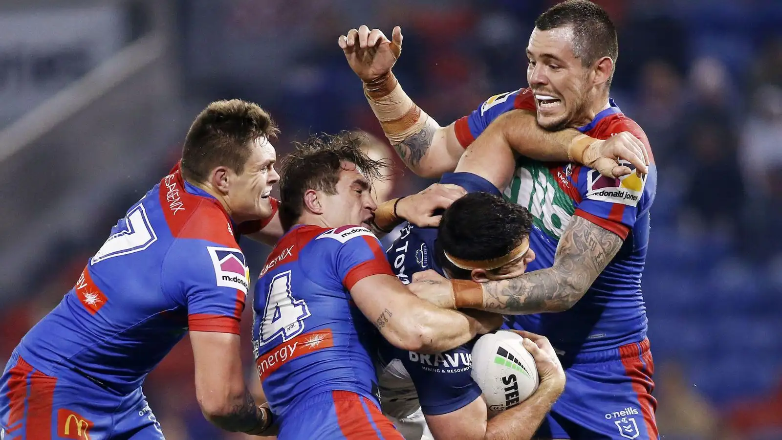 Connor Watson in action for Newcastle Knights in 2021 alongside then-team-mates Brodie Jones and David Klemmer. Photo by AAP Image/Darren Pateman.