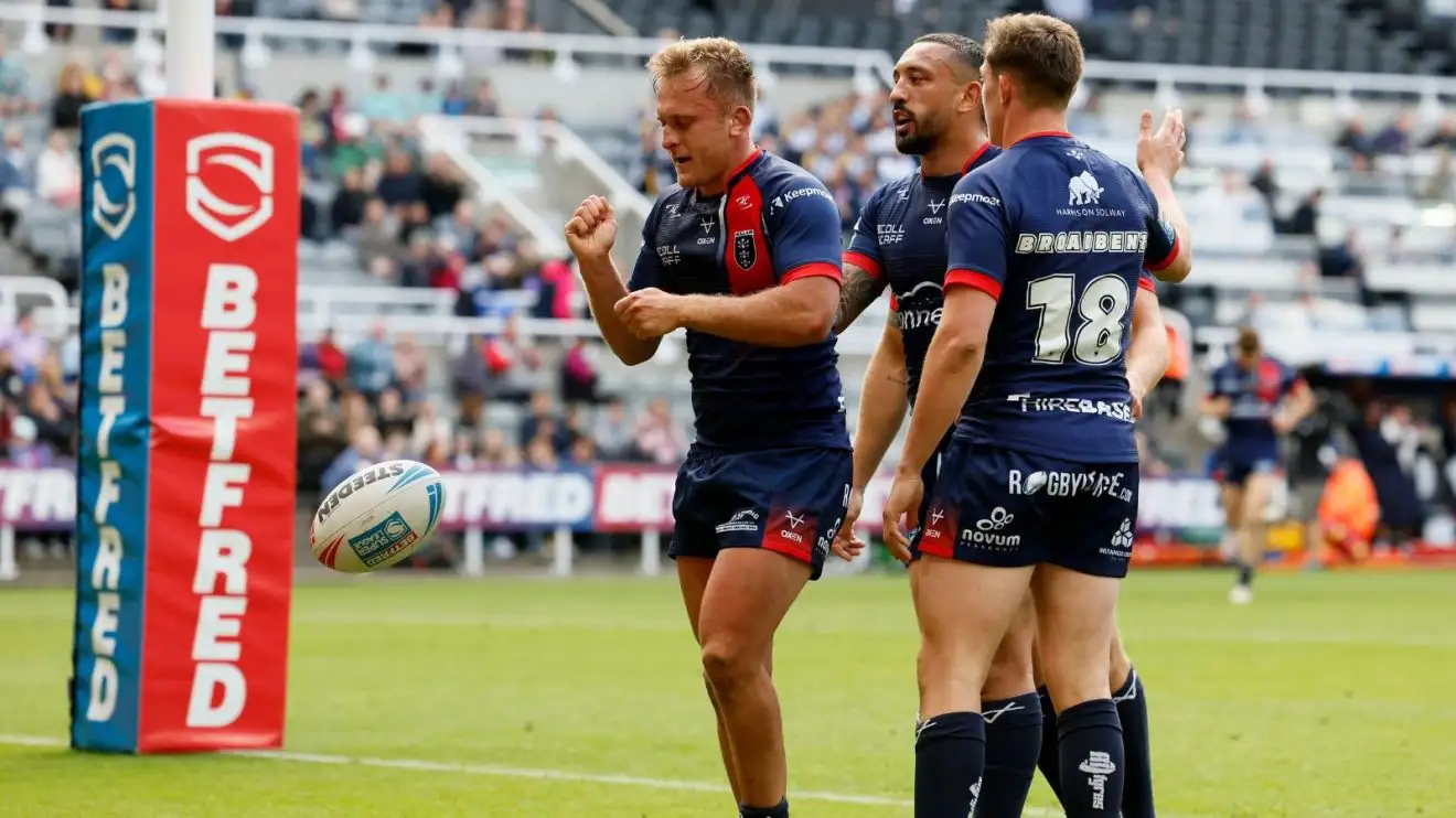 Jez Litten and his Hull KR team-mates celebrate a try at Magic Weekend in 2025, with their celebration in honour of one of the club's supporters battling MND