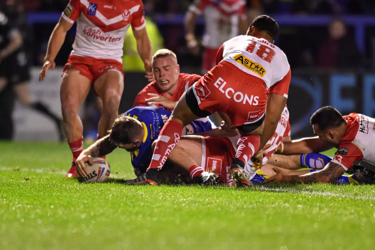 6th February 2020, Halliwell Jones Stadium, Warrington, England; Betfred Super League, Warrington Wolves v Saint Helens : Daryl Clark (9) of Warrington Wolves goes over for a try