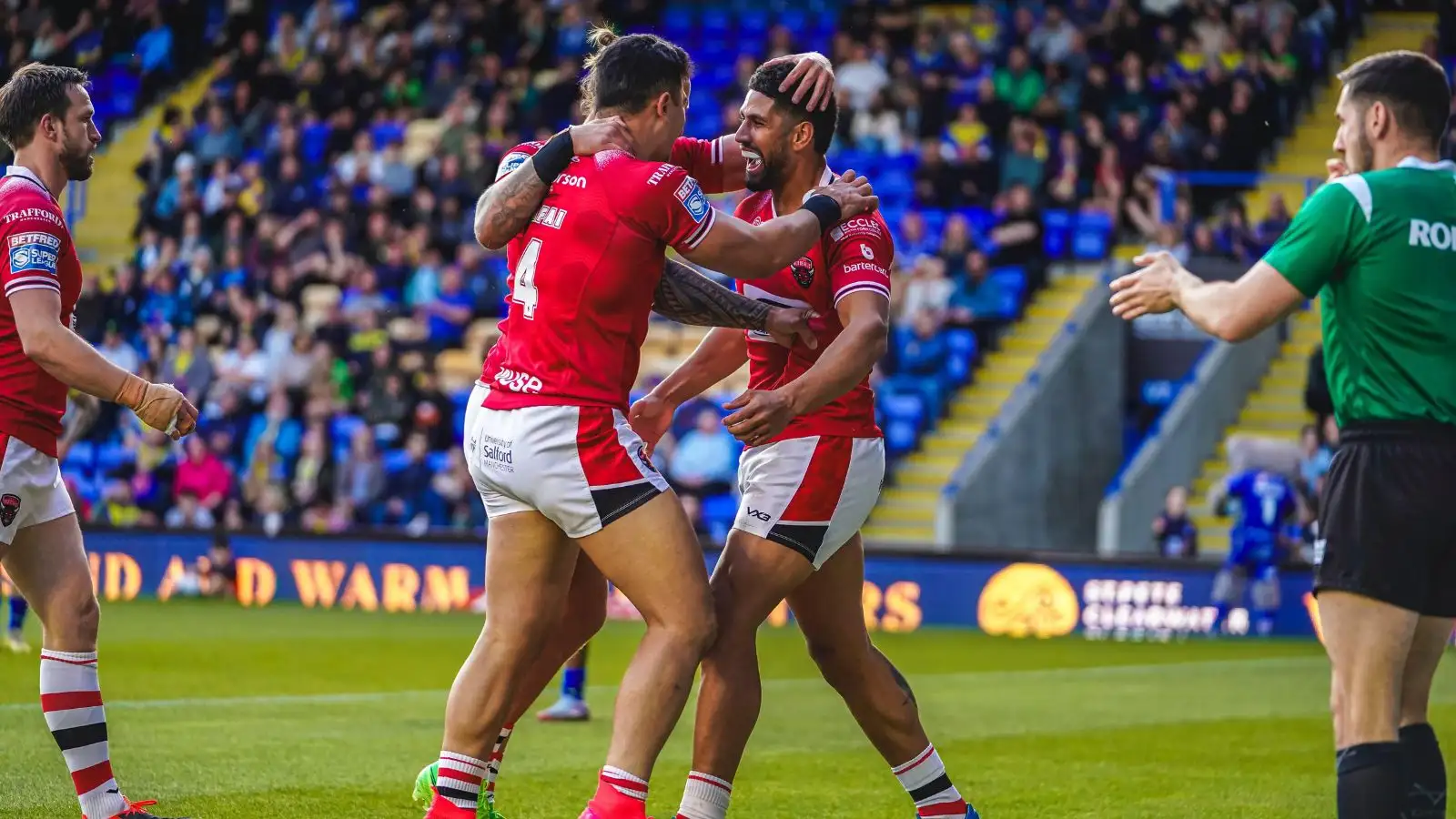 Nene Macdonald celebrates his try for Salford Red Devils away against Warrington Wolves in Round 14 of the 2024 Super League season