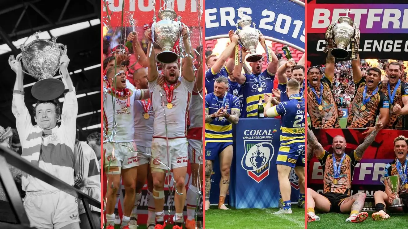 From left to right: Hull KR (1980), Catalans Dragons (2018), Warrington Wolves (2019) and Leigh Leopards (2023) lift the Challenge Cup