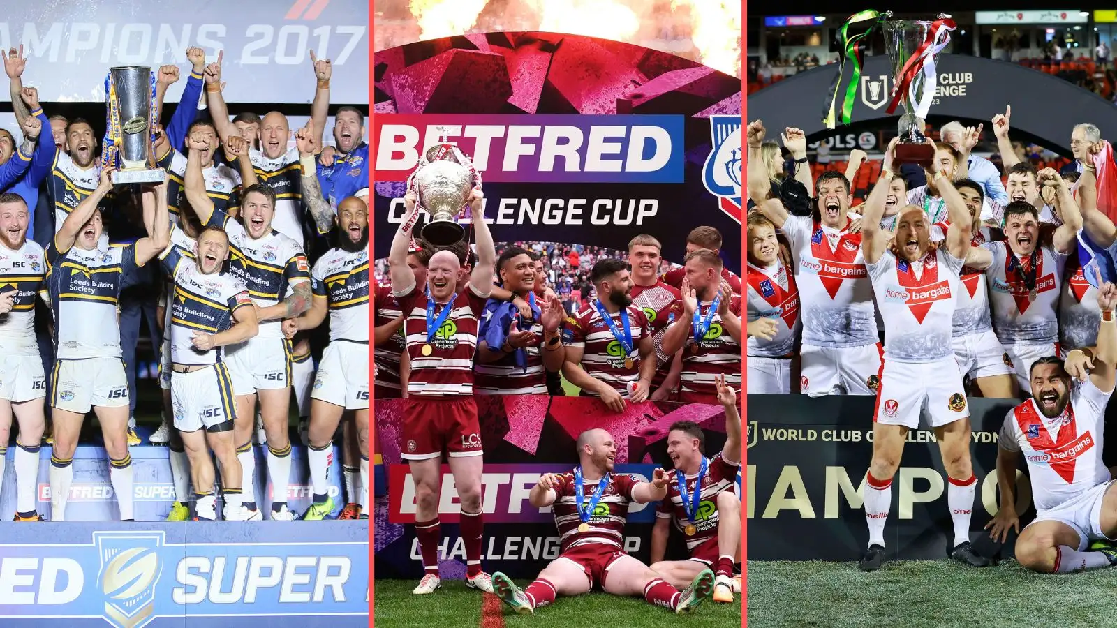 From left to right: Leeds Rhinos (2017, Super League), Wigan Warriors (2024, Challenge Cup) & St Helens (2023, World Club Challenge) all lift trophies