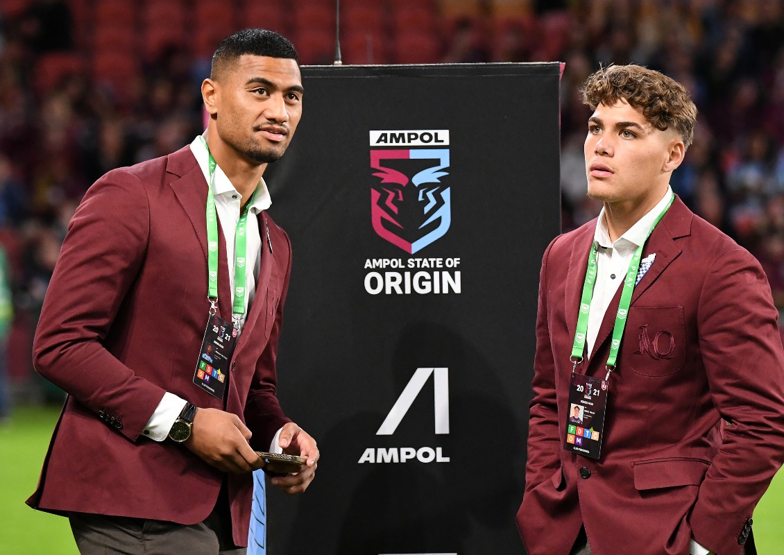 Ronaldo Mulitalo (left) and Reece Walsh are seen prior to Game 2 of the 2021 State of Origin series between the Queensland Maroons and New South Wales Blues at Suncorp Stadium in Brisbane, Sunday, June 27