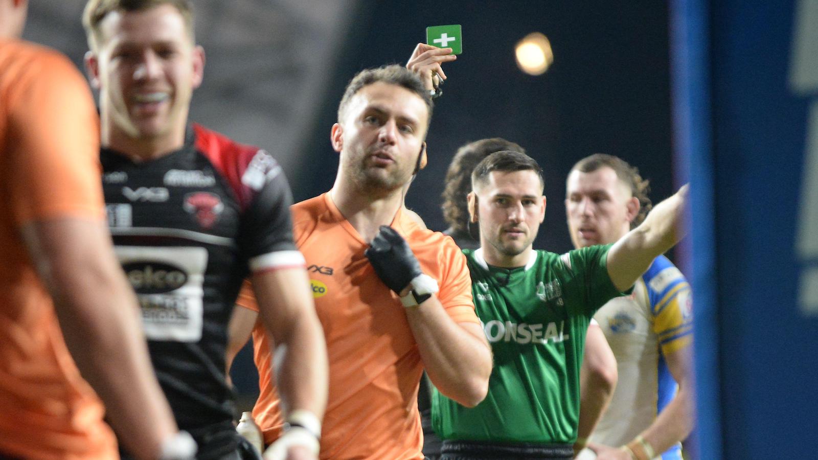 2WJP8N2 Aaron Moore issues a green medical card during the Betfred Super League Round 1 match Leeds Rhinos vs Salford Red Devils at Headingley Stadium, Leeds, United Kingdom, 16th February 2024 (Photo by Craig Cresswell/News Images)