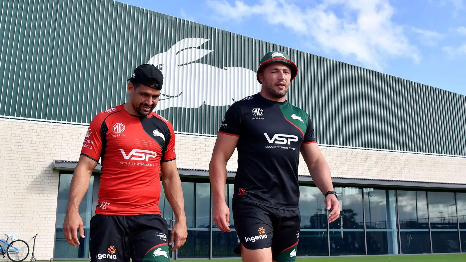 Sam Burgess and South Sydney Rabbitohs star Cody Walker during a training session at the Heffron Centre in Sydney. Photo by AAP Image/Bianca De Marchi.