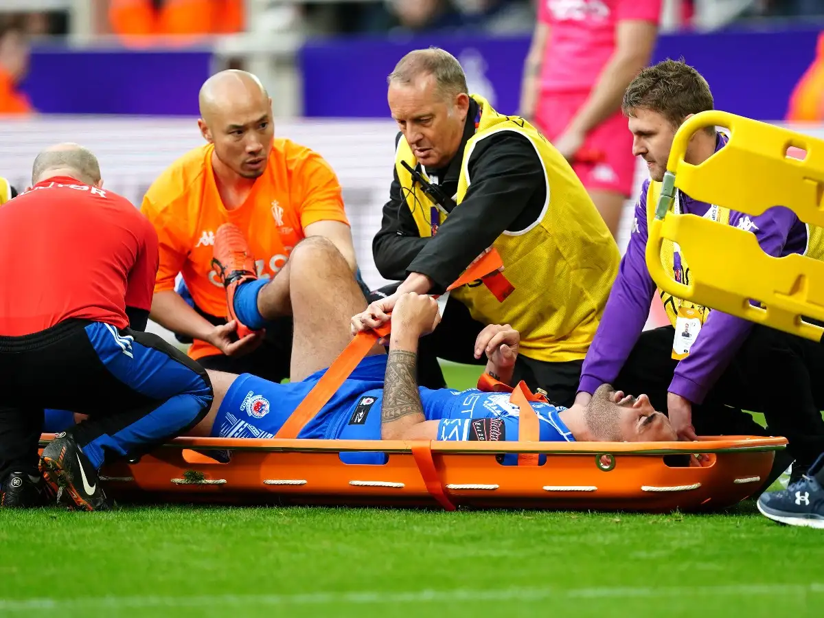 Samoa's Tyrone May is taken off the pitch by stretcher during the Rugby League World Cup group A match at St James' Park, Newcastle upon Tyne. Picture date: Saturday October 15, 2022. Mike Egerton/PA Wire/PA Images