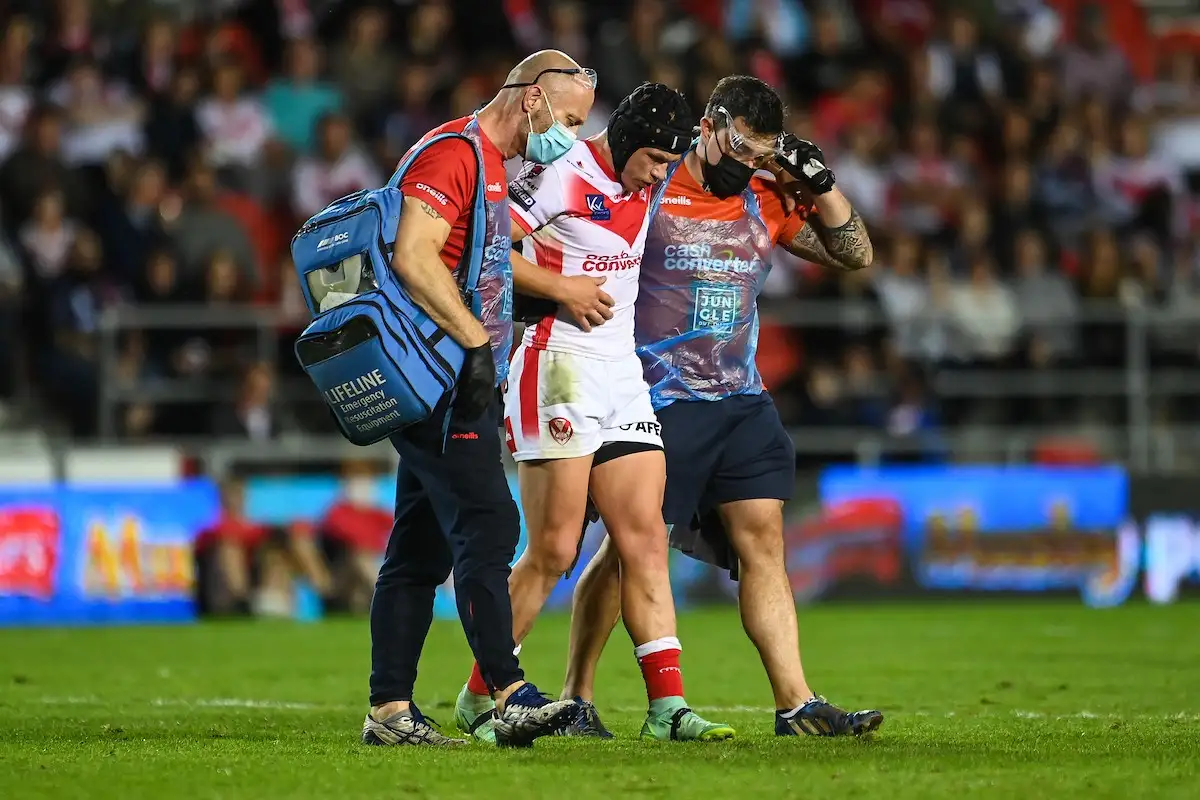 Jonny Lomax of St Helens leaves the field with an injury