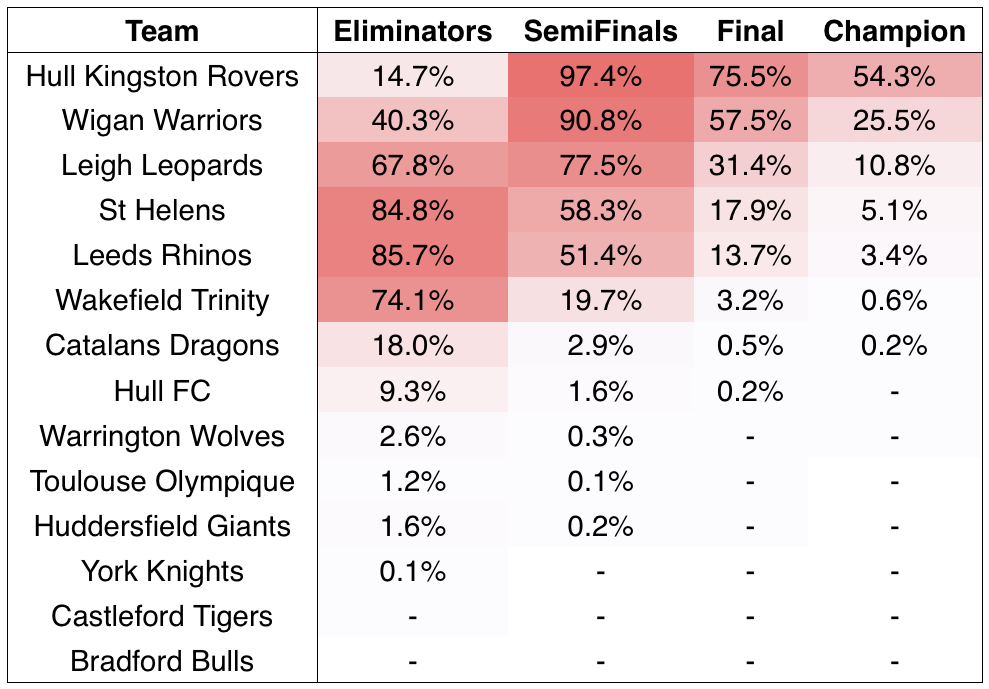 And the results are fascinating. It shows that the Robins will likely go on and defend the title they won last season at Old Trafford, with the supercomputer predicted they have a 75.5% chance of getting to another Grand Final and a 54.3% chance of winning Super League once again.