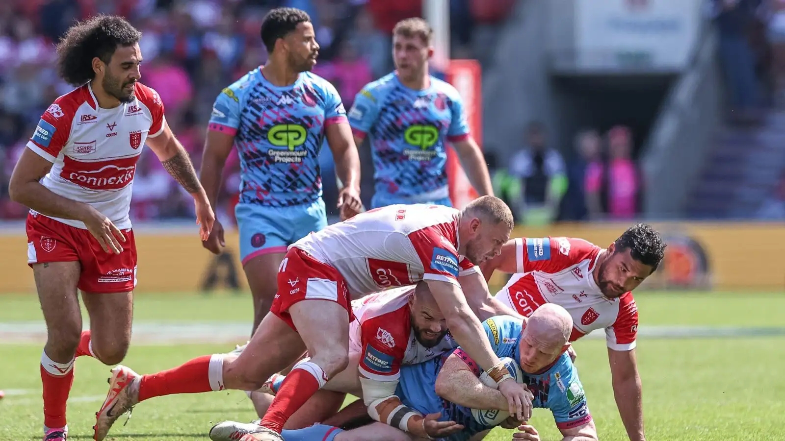 An action shot from the Challenge Cup semi-final clash between Wigan Warriors and Hull KR in 2024