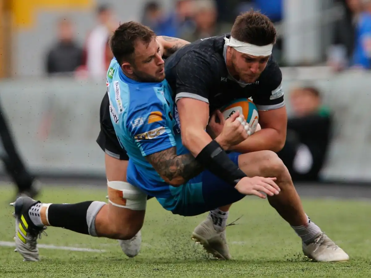 Sean Robinson of Newcastle Falcons is tackled by Kyle Evans of Doncaster Knights during the RFU Championship Cup match in 2019