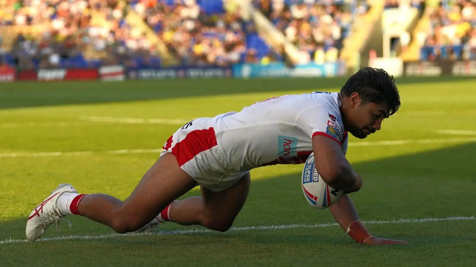 St Helens forward James Bell scores against Warrington. Photo by PA Images / Alamy Stock Photo.