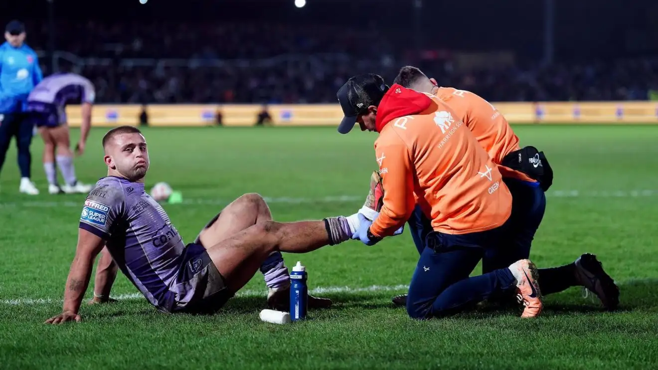 Mikey Lewis receives treatment having picked up an injury during Hull KR's win at Wakefield Trinity in Round 2 of the 2025 Super League season